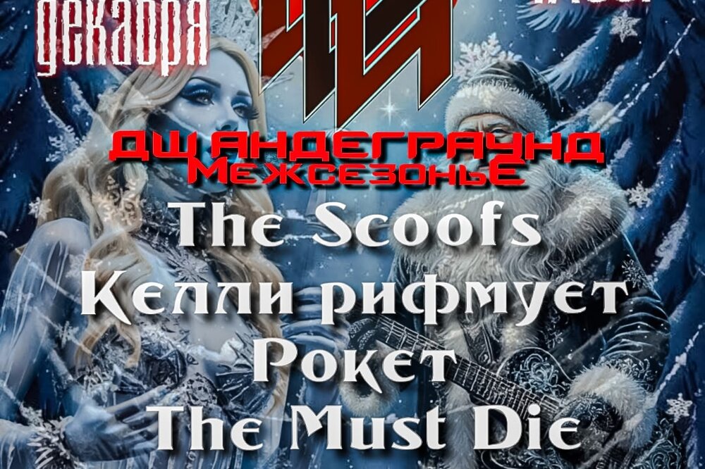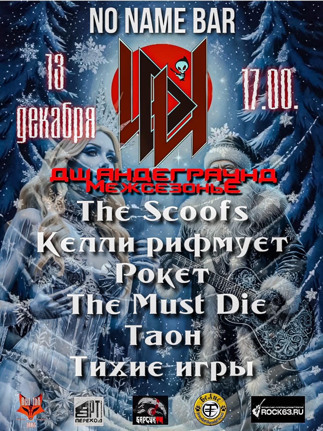суббота, 13 декабря 2025, 17:00 бар «No Name» Предновогодний рок-фестиваль. Море драйва от оригинальных, талантливых и ставших уже легендами команд. А так же розыгрыш ништяков за новогоднее настроение и костюмы На сцене: The Scoofs Келли рифмует Рокет The Must Die ТАОН Тихие Игры Стоимость билетов: В день концерта — 1000 руб.