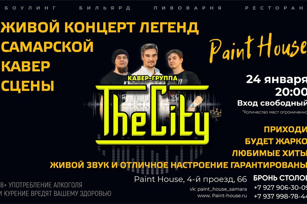 суббота, 24 января 2026, 20:00 центр «Paint House» «The City» — живой концерт легенд самарской кавер-сцены. Любимые хиты в авторской обработке. Вход свободный.
