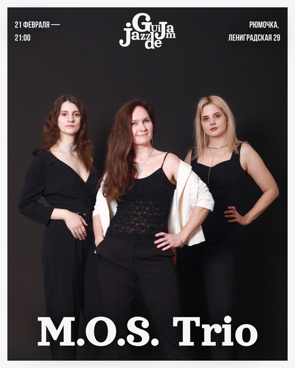 суббота, 21 февраля 2026, 21:00 бар «Рюмочка» Выступление джазового коллектива «M.O.S. Trio». Звучание фортепианного трио очень органично раскрывает и золотые стандарты, и композиции из около-джазовых стилей.