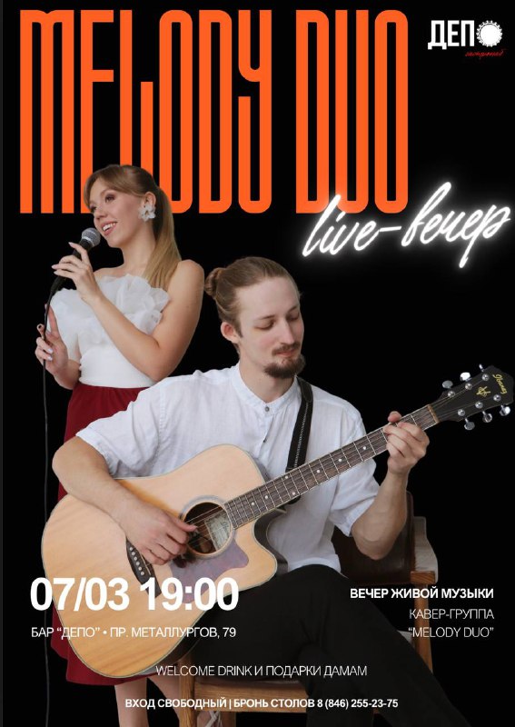суббота, 7 марта 2026, 19:00 бар «Депо» на Металлургов Выступление кавер-группы «Melody Duo». В программе вечера полюбившиеся хиты, лирические и танцевальные — что еще нужно? Только подпевать! Вход свободный.
